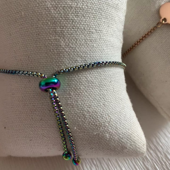 Pulsera Corazón Corrediza de Acero, elegante y ajustable, con un delicado dije en forma de corazón grabable. Su diseño moderno y brillante la convierte en una pieza perfecta para usar a diario o regalar en ocasiones especiales. Un símbolo de amor y conexión grabado con precisión y cuidado.