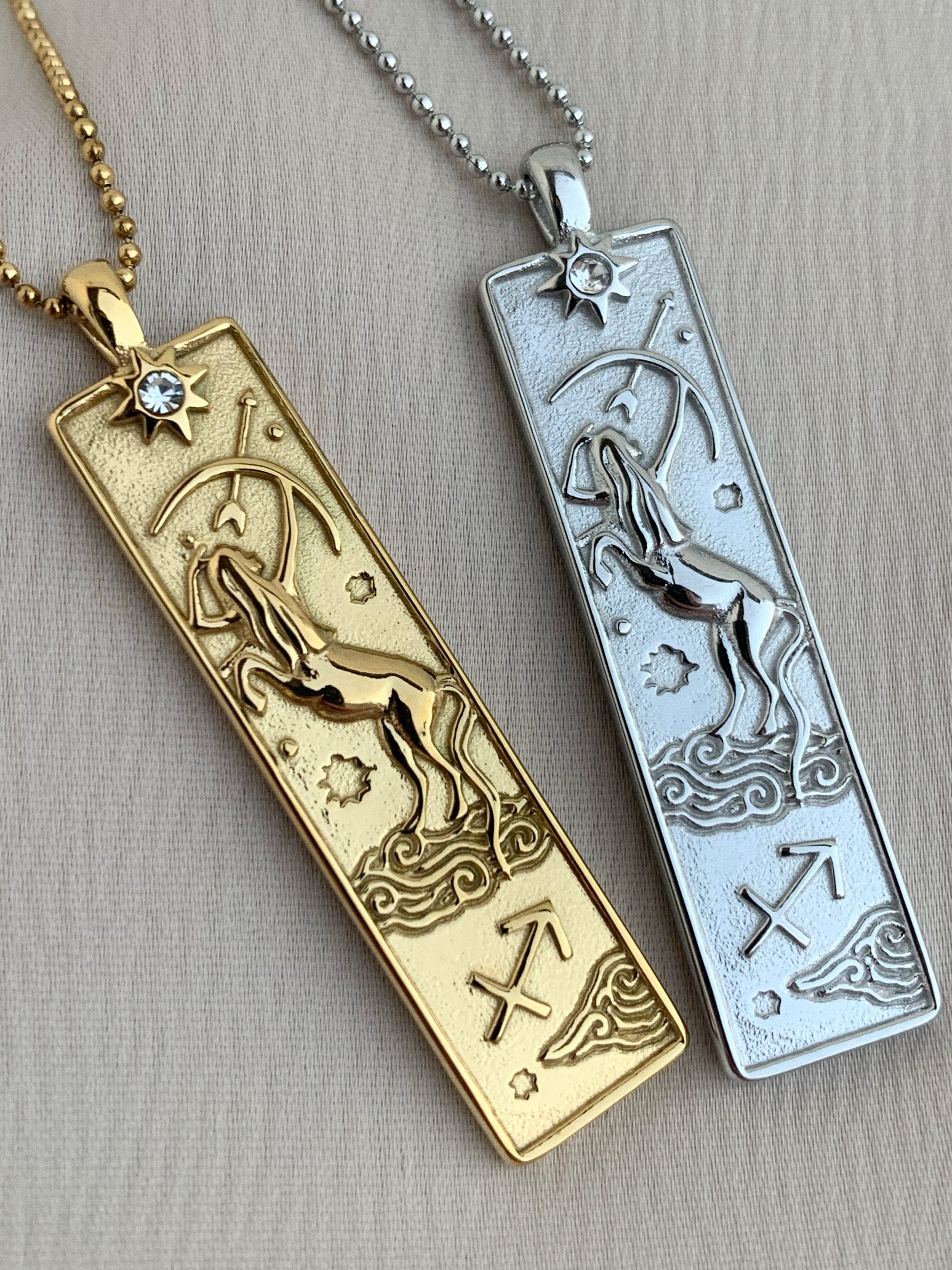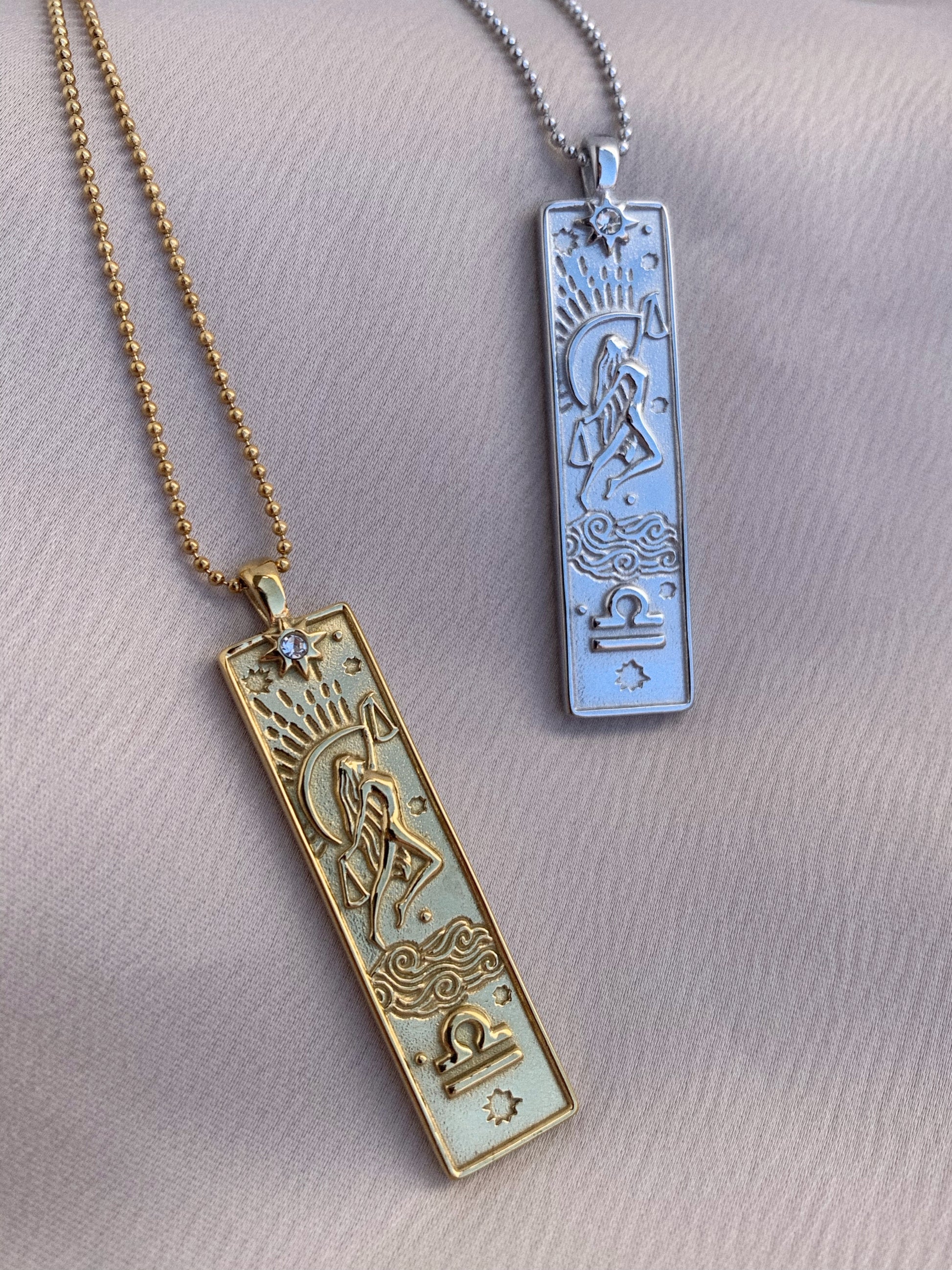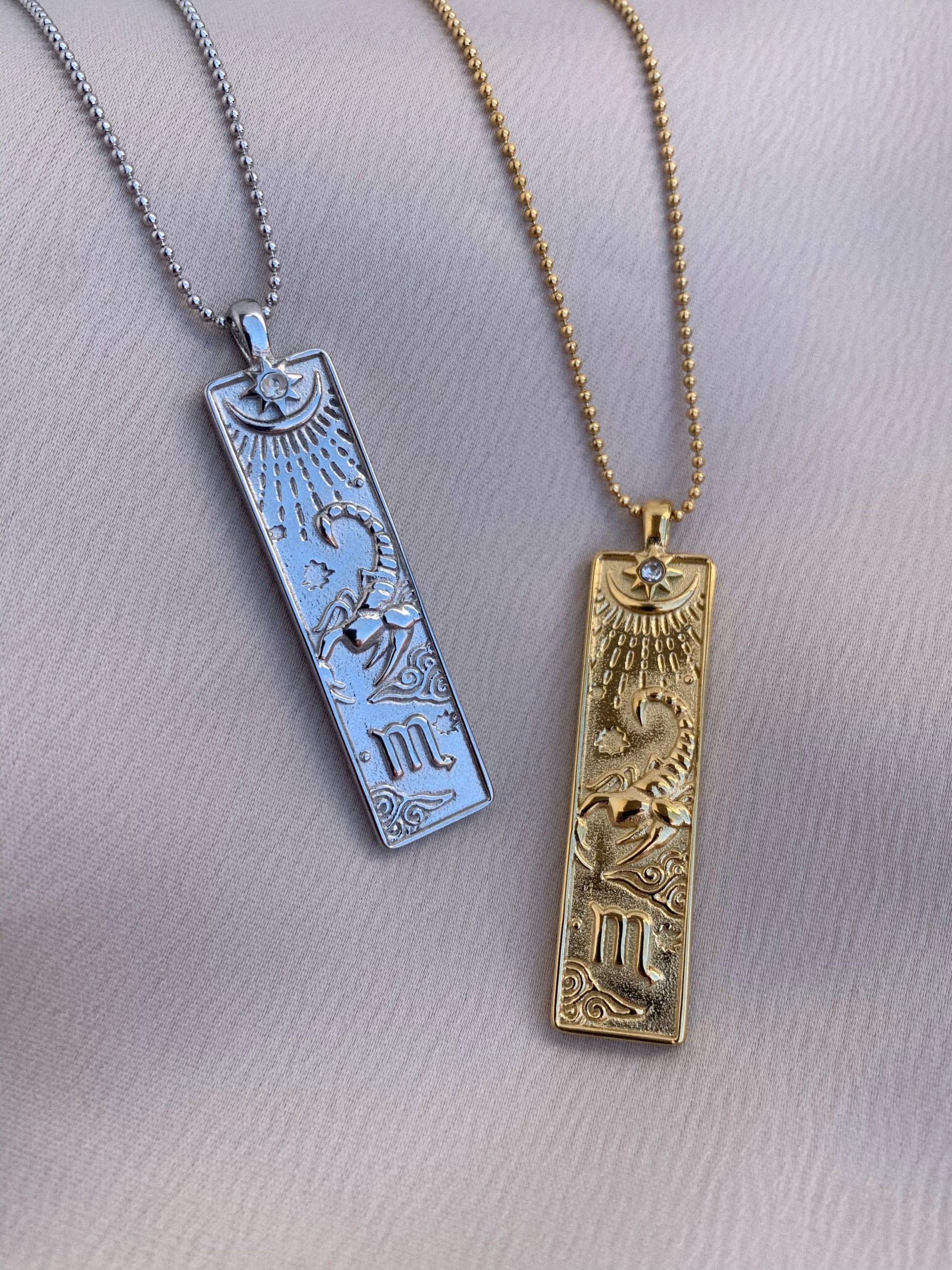 Collar Zodiac Glow disponible en color plata u oro. Cada pieza representa uno de los 12 signos del zodíaco, grabado con láser en acero inoxidable de alta calidad. Ideal para quienes aman las joyas con significado, conexión y estilo celestial ✨
